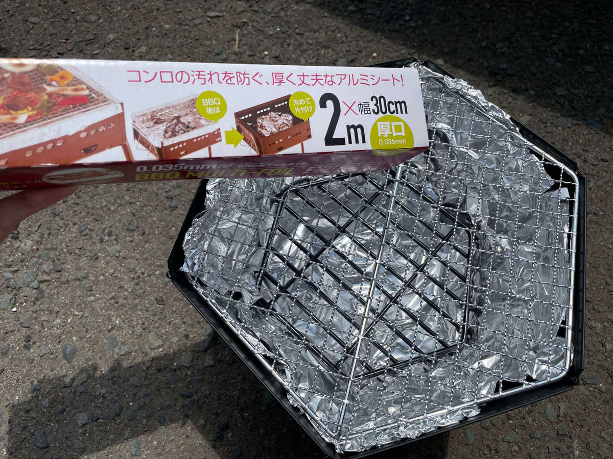 今回は焚き火台にダイソーで購入したアルミシートを敷きます。