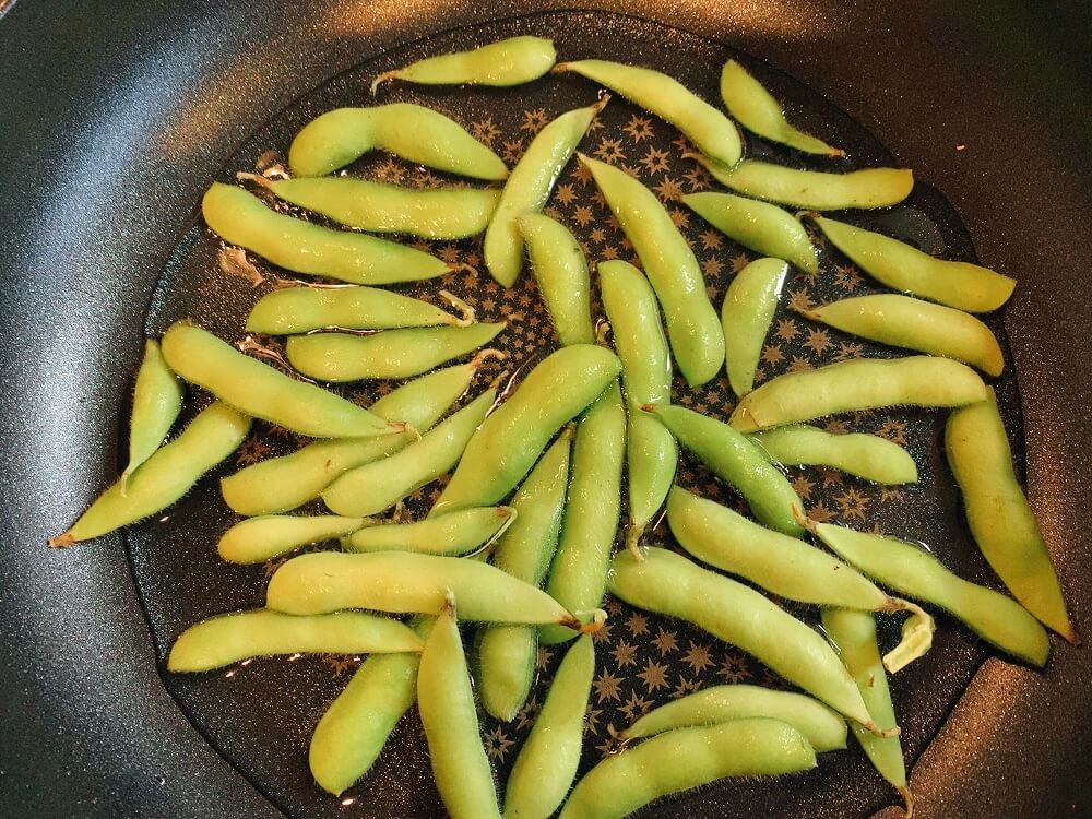 枝豆を1~2分程度茹でるか、蒸し焼きにします。今回は、上記で紹介した方法で、塩はふらない状態で「蒸し焼き」にしました。