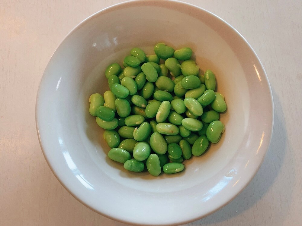 蒸し上がった枝豆の粗熱がとれたら、サヤから実を取りだしてください。