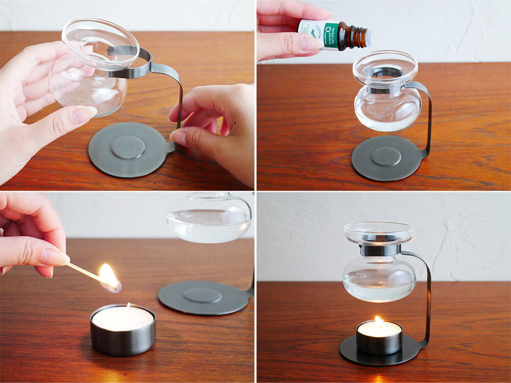 ④キャンドルをスタンドに戻し、香りをお楽しみください。 (※長時間の加熱は突沸の原因となりますので、使用時間は1回30分を目途にしてください。)