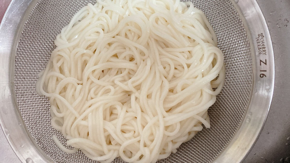 そうめんでもいけるのでは……?と、作る前は考えていましたが、調味料やビビンバの具と絡ませる点を考慮すると、ひやむぎが食べやすくてベストマッチですね。