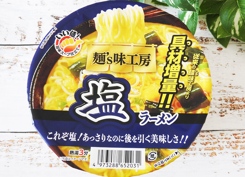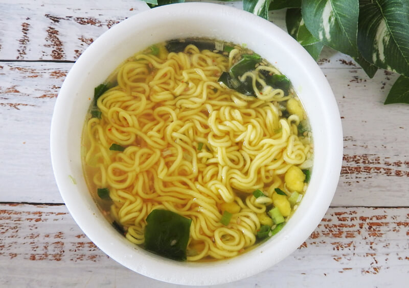 上で紹介した麺’s味工房「醤油ラーメン」とかやくが同じじゃないか!というツッコミもありつつ、塩っ気のあるスープはたしかに塩ラーメンですね。他社の塩ラーメンよりもやや薄めな気がしますが、充分な味はついていますよ。