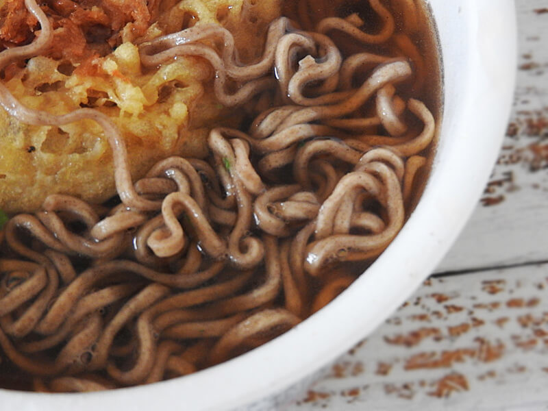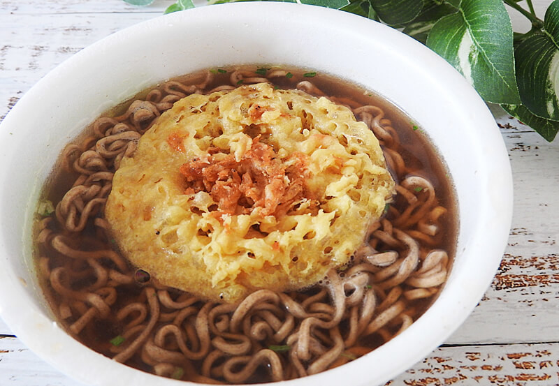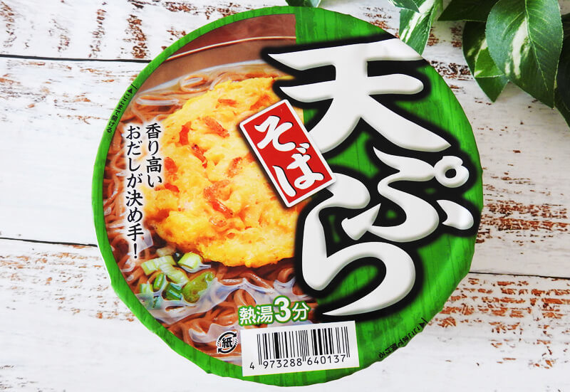 最後に、天ぷらそばをいただきます。これもマルちゃん「緑のたぬき」を彷彿とさせるパッケージですね……。上に乗せる天ぷらのクオリティはいかに……。