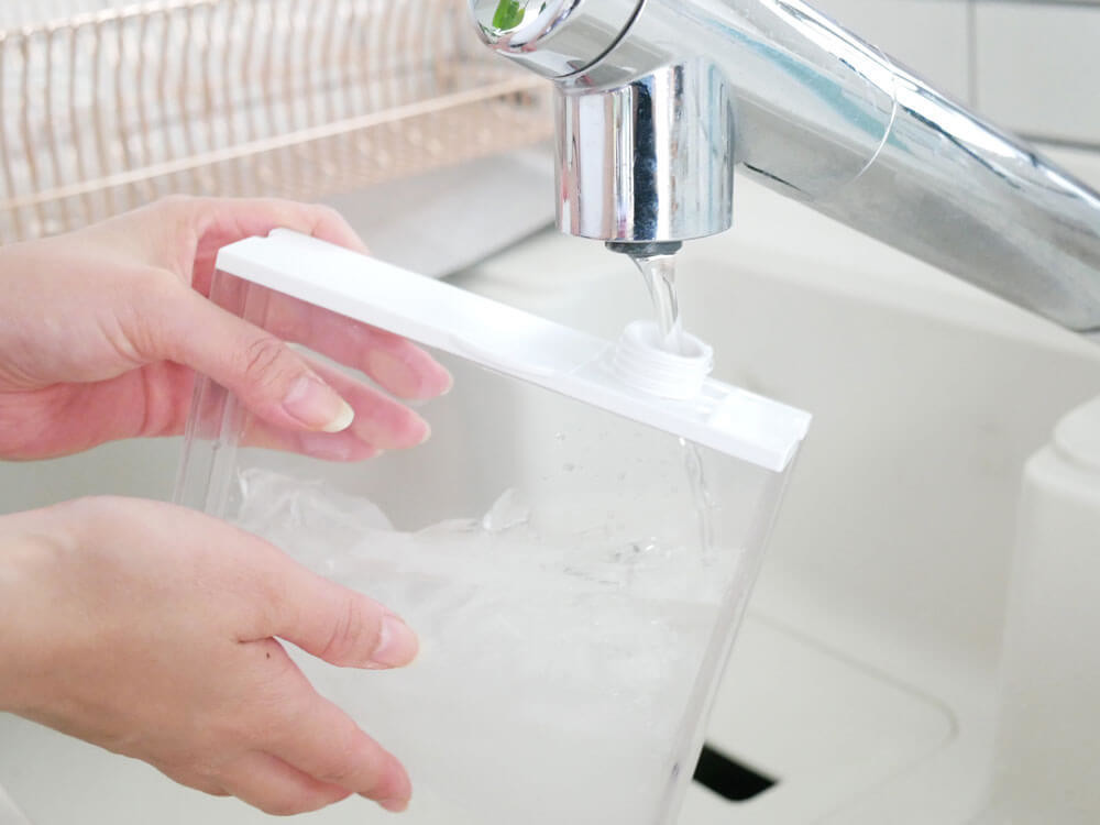 〈使い方〉 本体から水タンクを取り外し、その中に水や氷を入れます。しっかりキャップを締め、本体に取り付ければ完了。