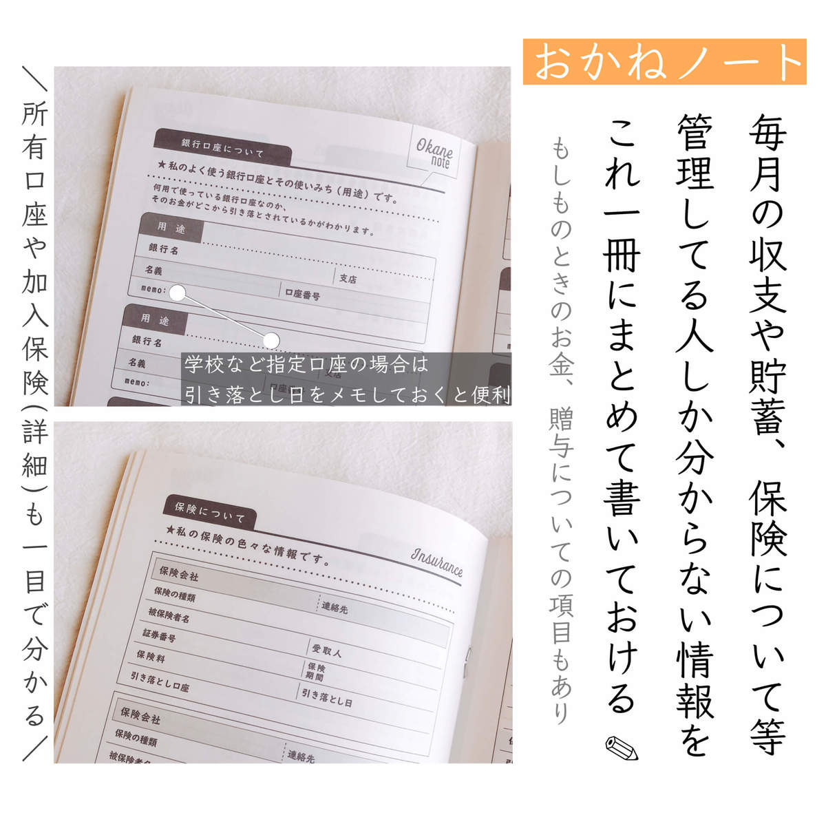 「おかねノート」は、毎月の収入や貯蓄など家計簿の延長のような内容から、保険などについても記入できるノートです。