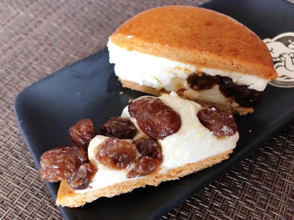 バタービスケットサンドは、ラムレーズン、ショコラ、チーズの3種類。私は大好きなラムレーズンを選んだのですが、ご覧の通り、はみ出るほどたくさんのラムレーズンが使われていてテンションが上がりました。
