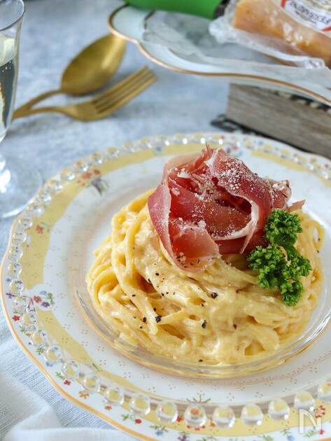 濃厚クリーミーなカルボナーラ風の一品は、子供たちが飛んで喜ぶこと間違いなしな味わい。一口食べれば一気に至福の気分に浸れますよ。スパサラですが、冷製パスタとして主食でも食べられます。(調理時間:15分)