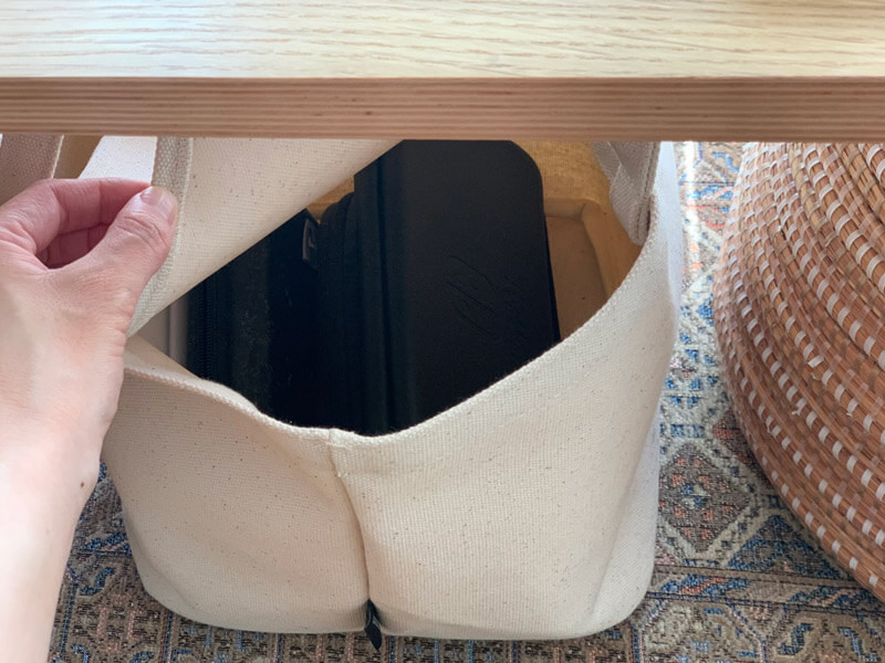 「目隠しできる帆布素材の収納トート」に収納で、問題解決です。