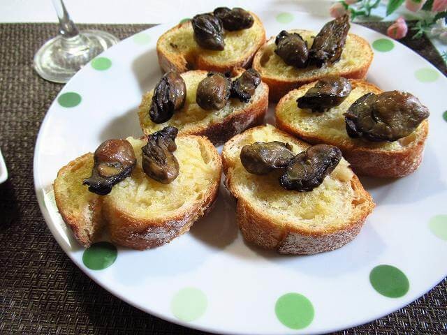 2.燻製牡蠣のオイル漬けを2個ずつ乗せて、トースターで焼いたら完成!