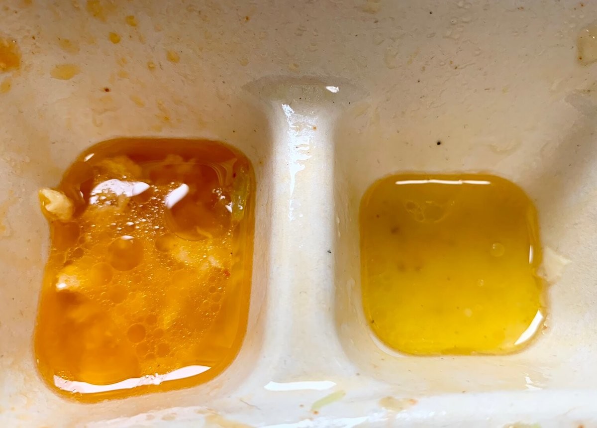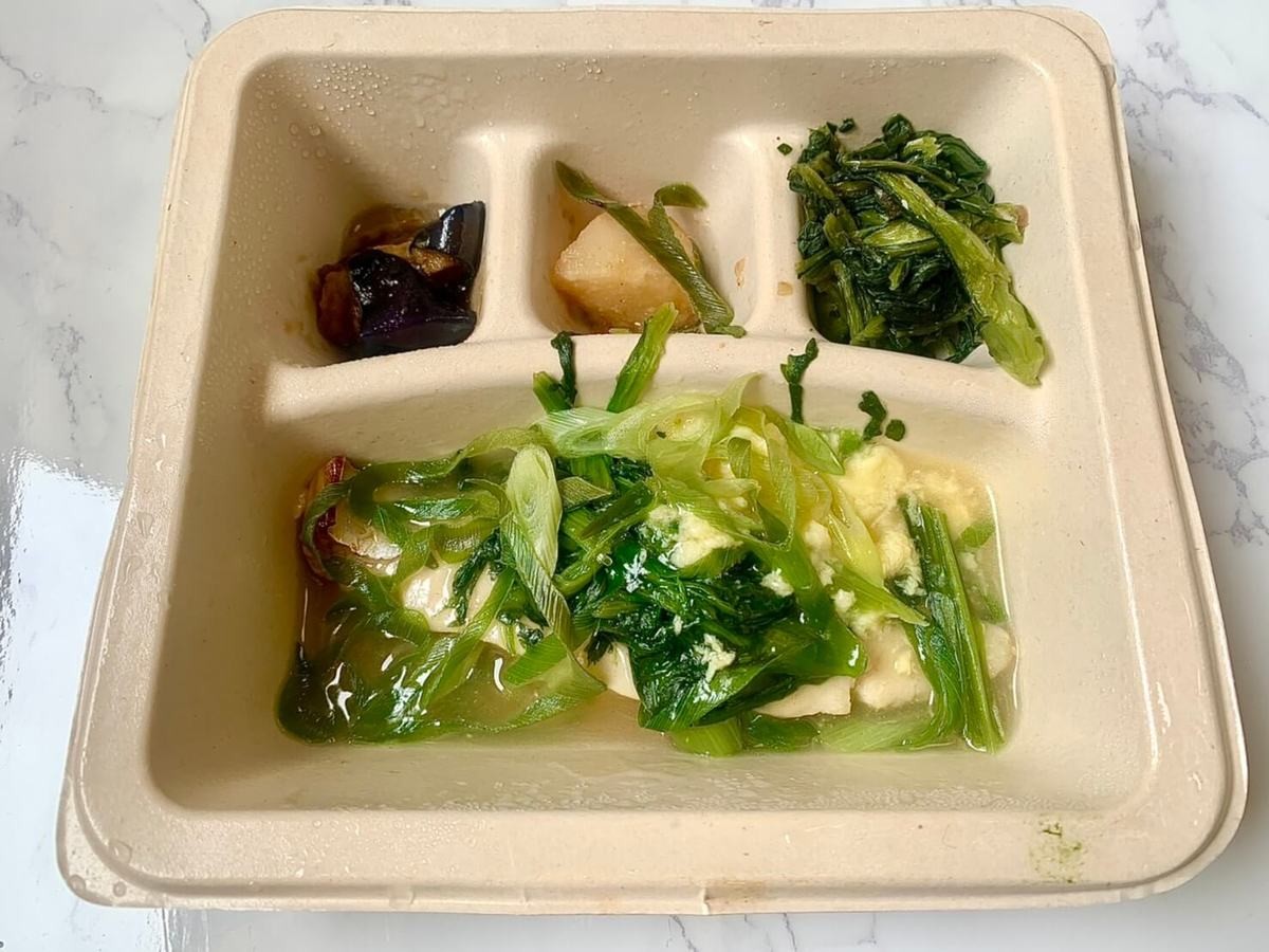 こちらの弁当の副菜すべてから水が出ていて、味がとても薄かったです。写真の通り、食材がひたひたになるくらい水分がでてしまっています。今回食べたメニューの副菜の中で、これが一番好みではなかったです。