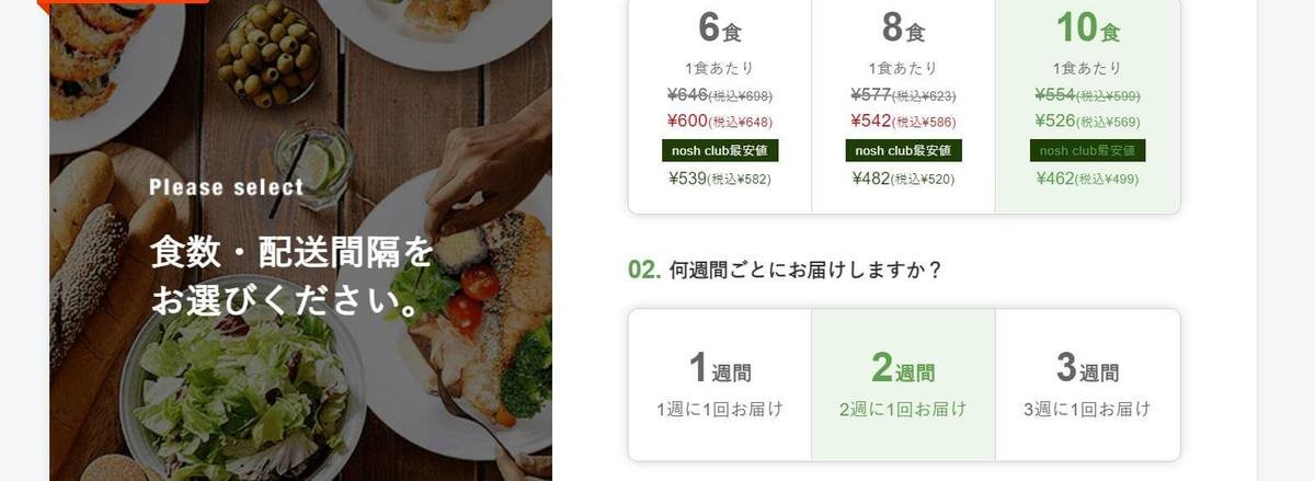 定期便は公式サイトから注文できます。6・8・10食、何週間ごとの配送が希望なのかクリックして、チェックすると「メニューを選択する」ボタンが緑色に光るので、そこをクリックしてください。