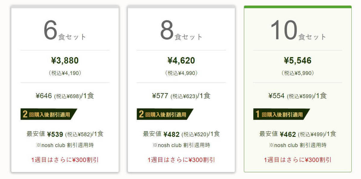 どれだけ味がよくても気になるのは価格……。1食の価格が高いと継続するのが難しいですよね。noshの価格は6・8・10食によって違いますが、一番お得な10食だと1食「599円(税込)」。