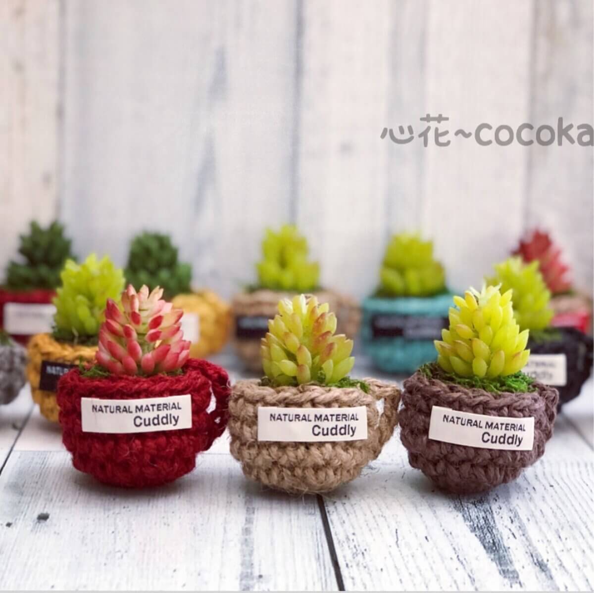 麻紐を使って作られたコーヒーカップにフェイク多肉植物を飾ったもので、玄関やトイレにピッタリ♪デスクに飾っても癒し効果抜群です。