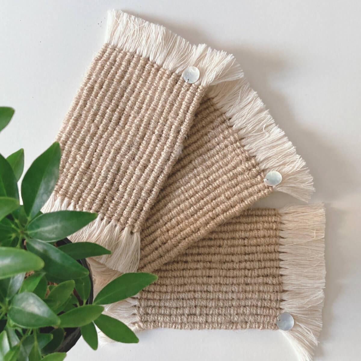 どんな雰囲気にも馴染みやすい、マクラメ編みの麻ミニマットです。