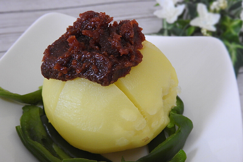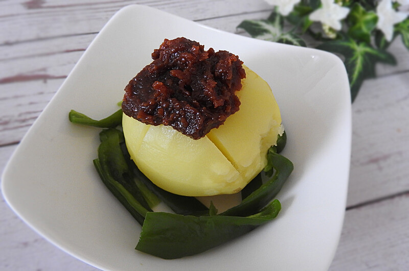 そこからヒントを得て、よく煮たじゃがいもの上に、「おかず味噌 国産にんにく」をのせてみましたよ。