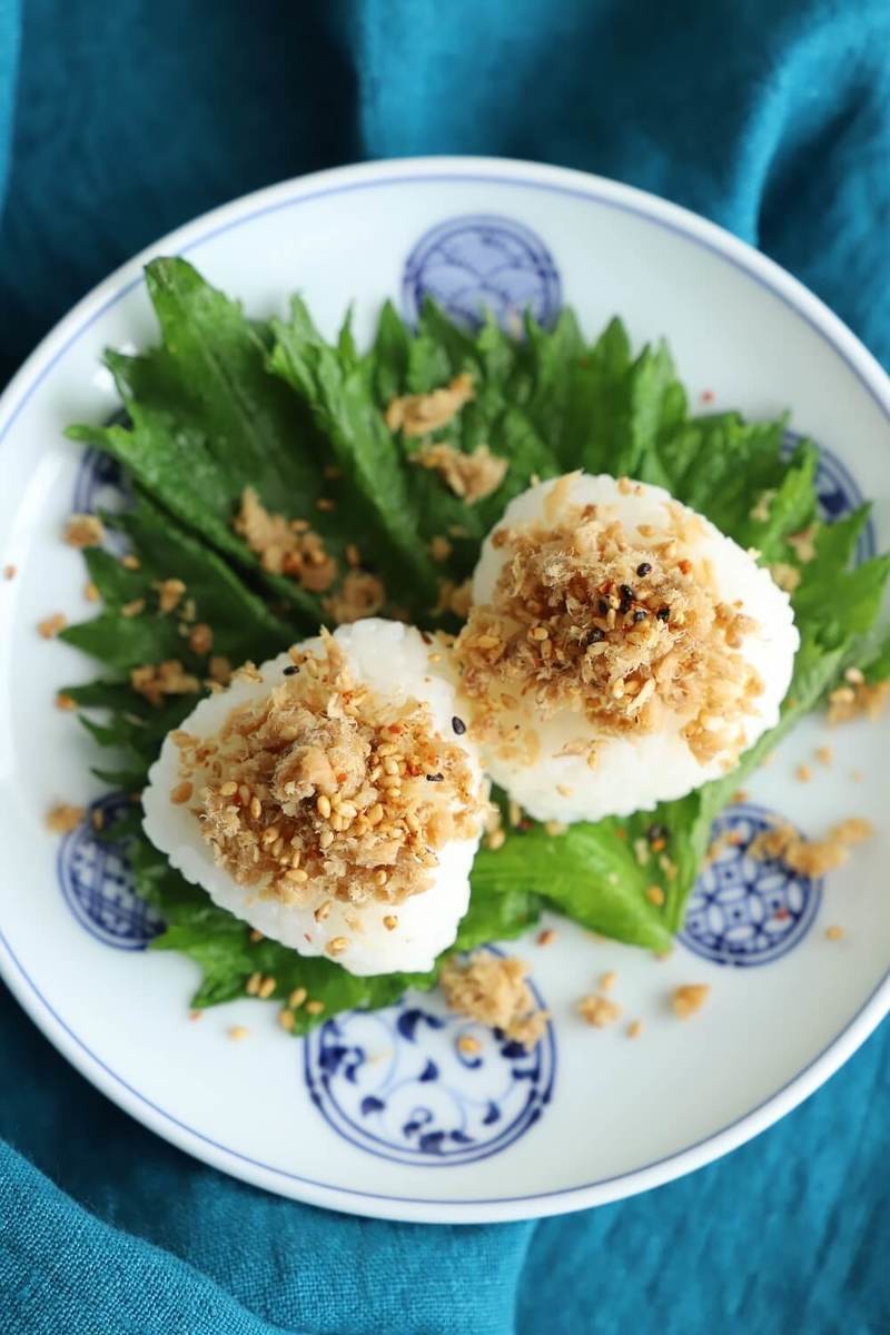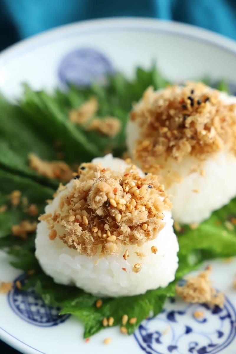 一口サイズのおにぎりにたっぷりとかけ、その上からごま七味を振りかけています。