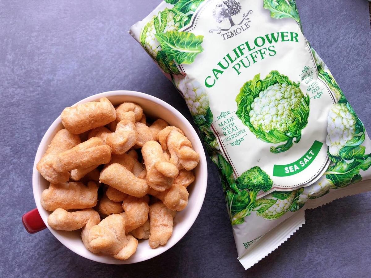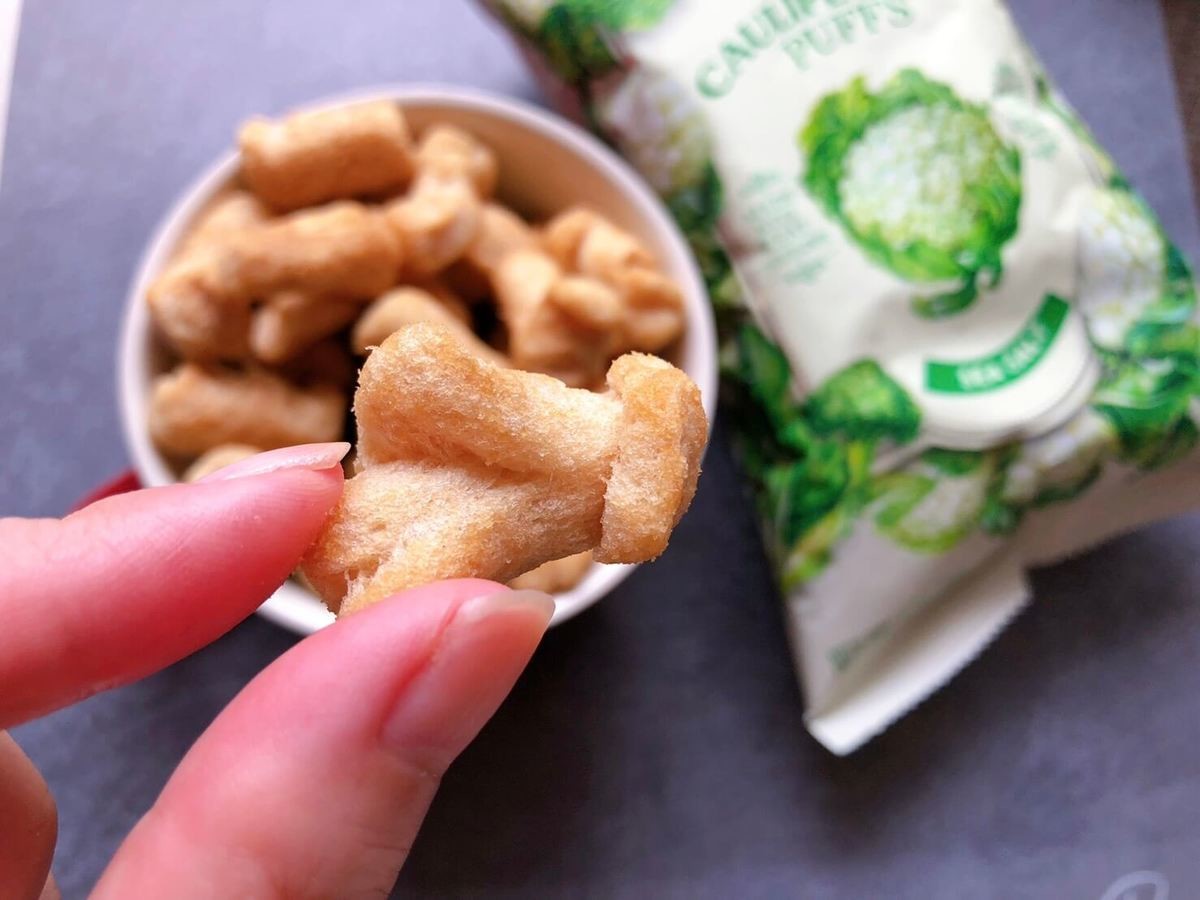 開けてみると、フワッとした軽いスナックが出てきました。買った後に知ったのですが、成分はカリフラワー、米、米油、食塩のみで、添加物不使用!グルテンフリーのお菓子でした。