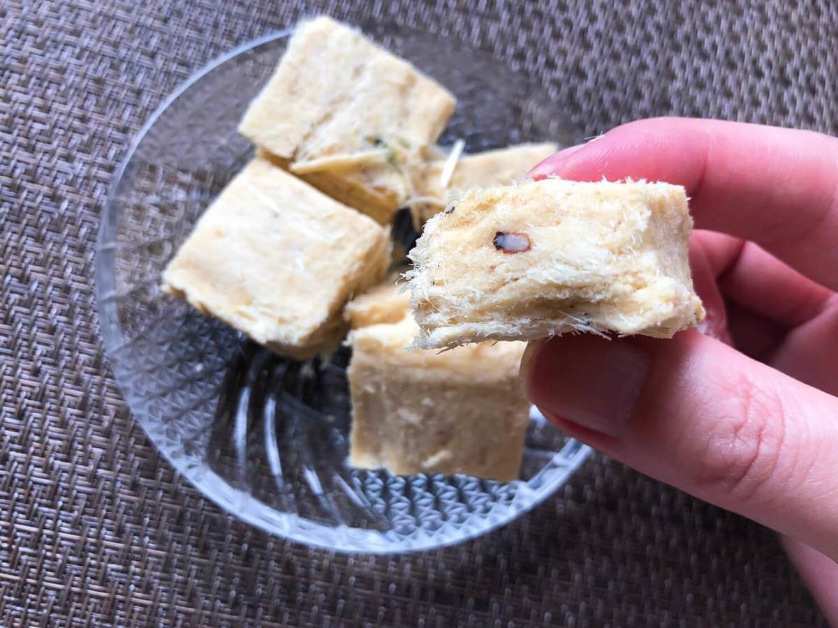 持ち上げる時はそーっと動かさないとホロリと崩れてしまうので注意が必要。口に入れると、繊細な繊維のような生地がホロホロほどけ、一瞬で溶けて形がなくなります。これがもうクセになる!