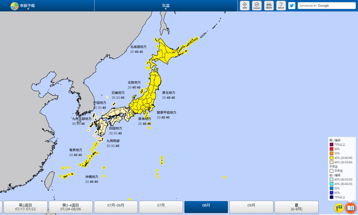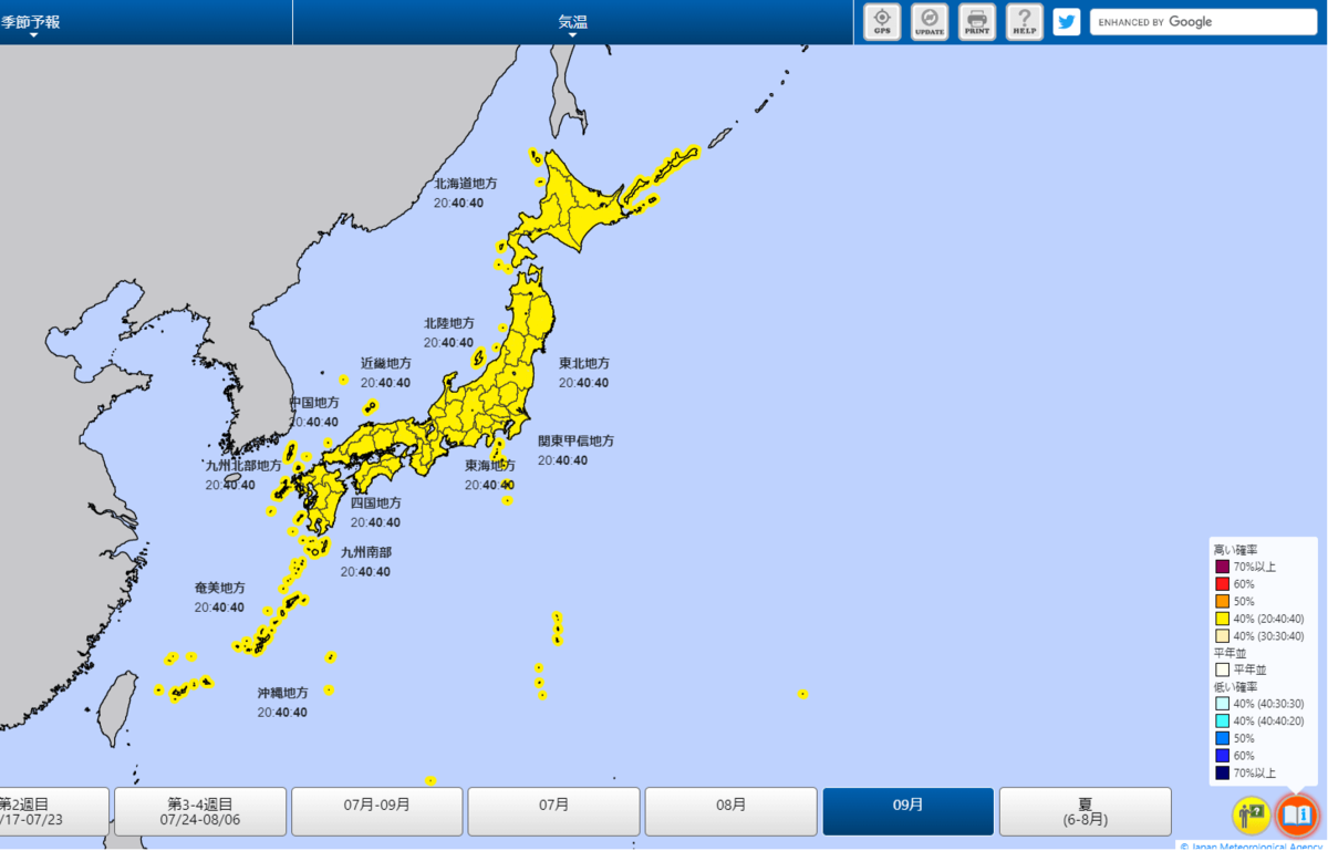 気象庁が発表する向う3か月の予報は、全国的に平年並みまたは高い確率ともに40%を発表しているため、平年より暑くなることが想定されます。