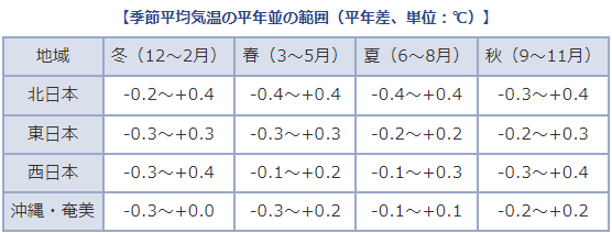 この平年並みの値に対して、前後何度までを平年並みとするかは北日本、東日本、西日本、沖縄・奄美のエリアごとで異なります。