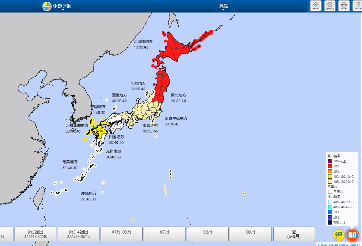 気温においては、全国的に平年並みまたは高くなる確率が40%です。したがって、強い太陽の日差しが手助けとなり暑さのピークとなるでしょう。