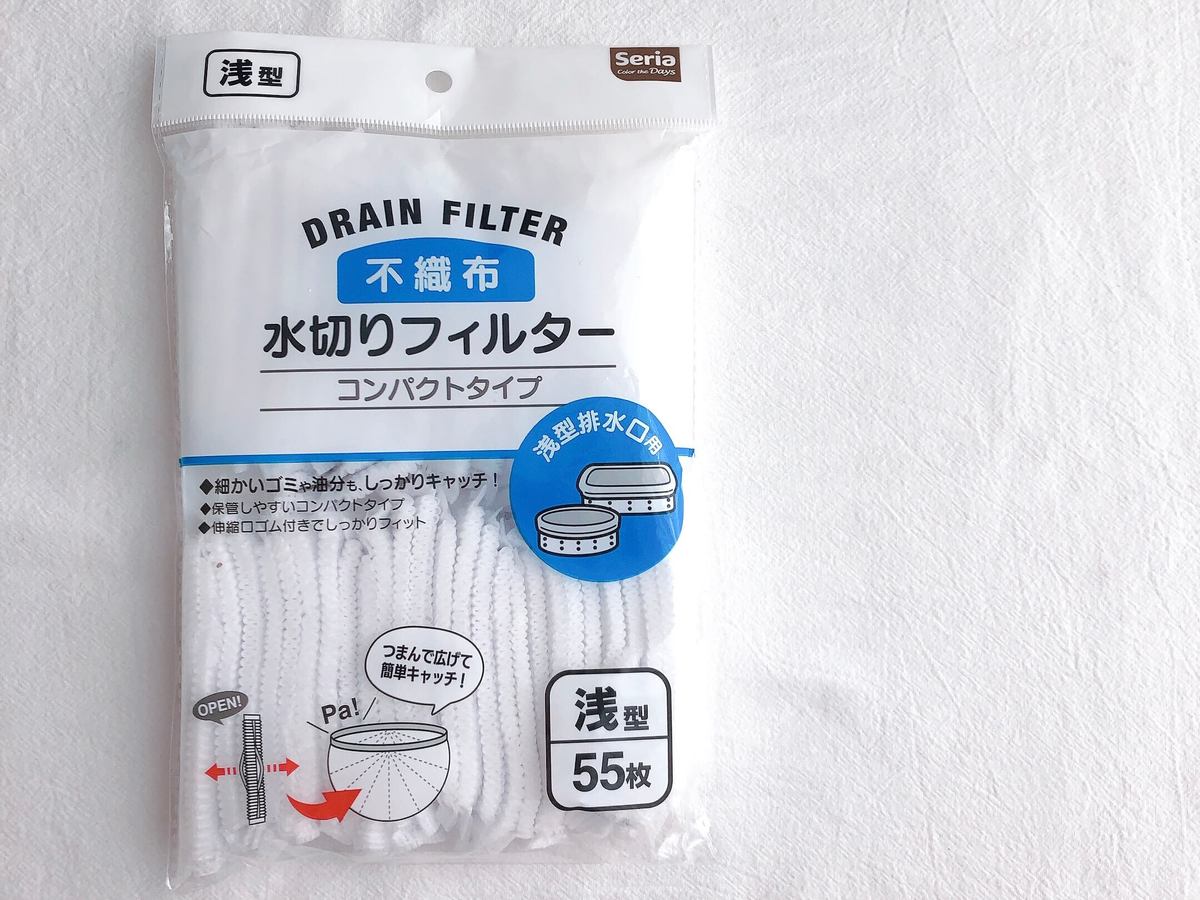 ごめんリピは無し!【セリア】「55枚入りで110円不織布水切りフィルター」お得だから試す価値アリ「キッチン進化系」
