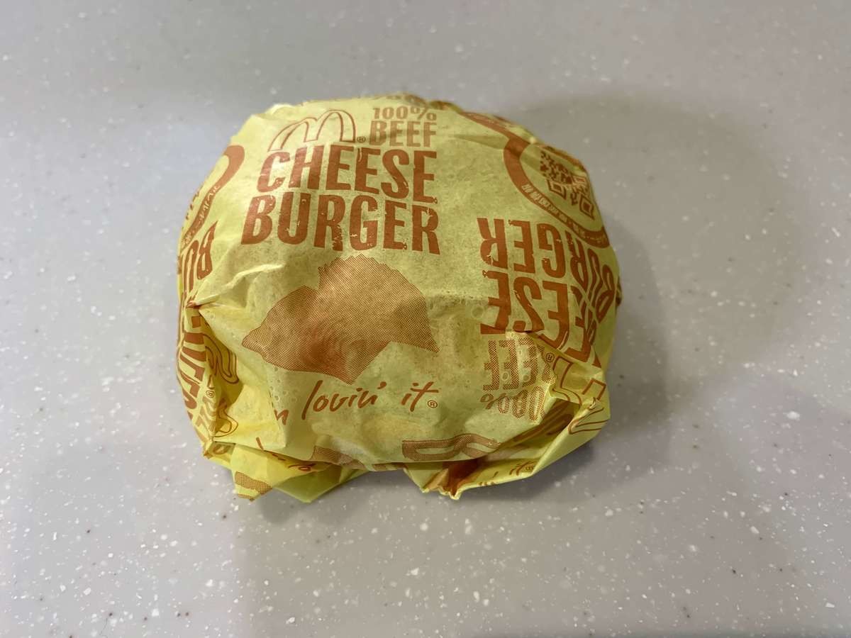 まずはマックの人気メニュー「チーズバーガー」から! 食べたい衝動を抑えつつ、紙包みのまま冷凍室に入れて一日冷やしました。買ってすぐに食べられない悲しさが凄いです(笑)。