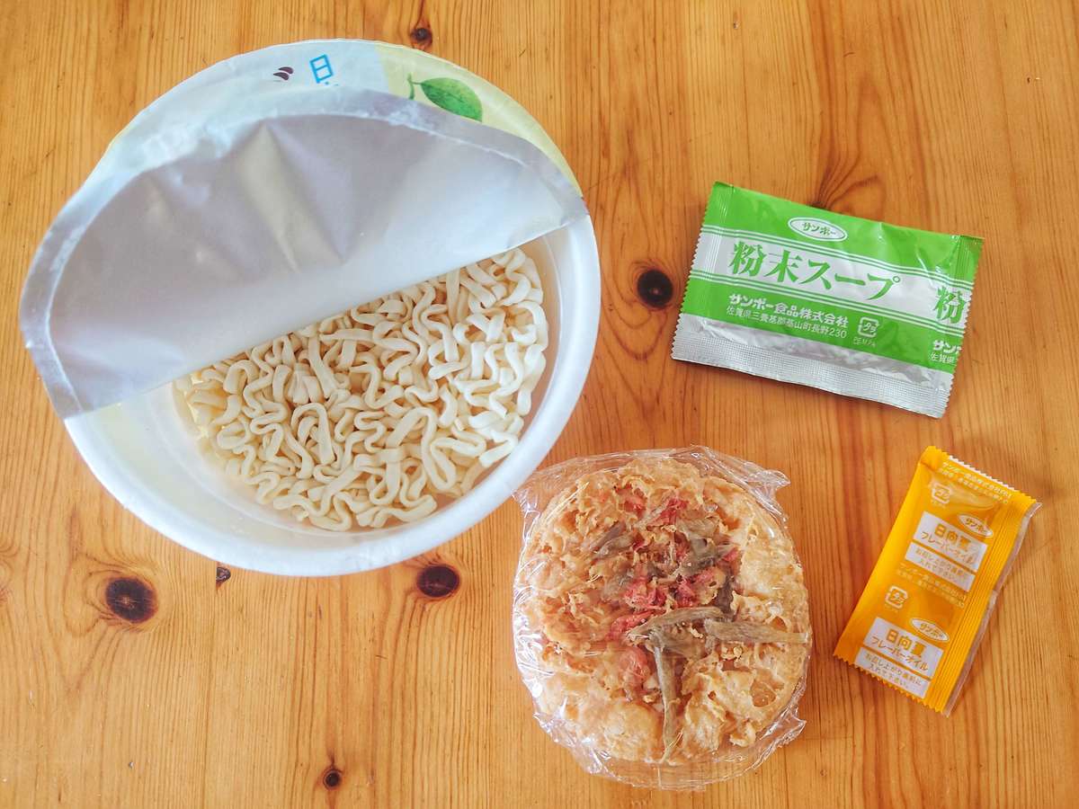時間になったら、粉末スープと日向夏フレーバーオイルを入れてごぼう天をのせるだけ♪