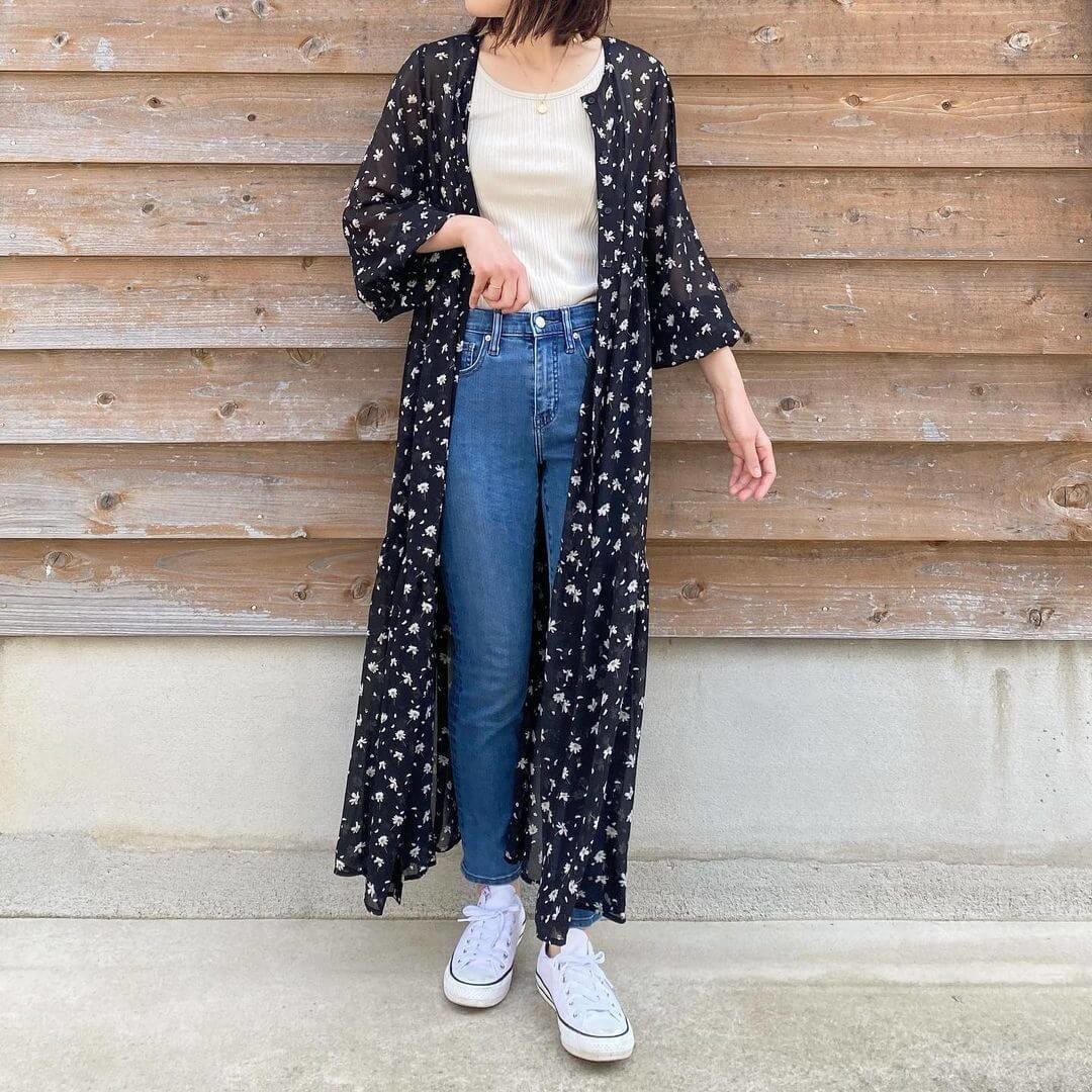 タンクトップと着こなした王道カジュアルコーデに、花柄シャツワンピースをプラス。