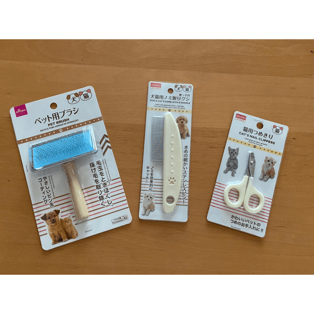 左から、ペット用ブラシ、ノミ取りクシ、爪切りです。