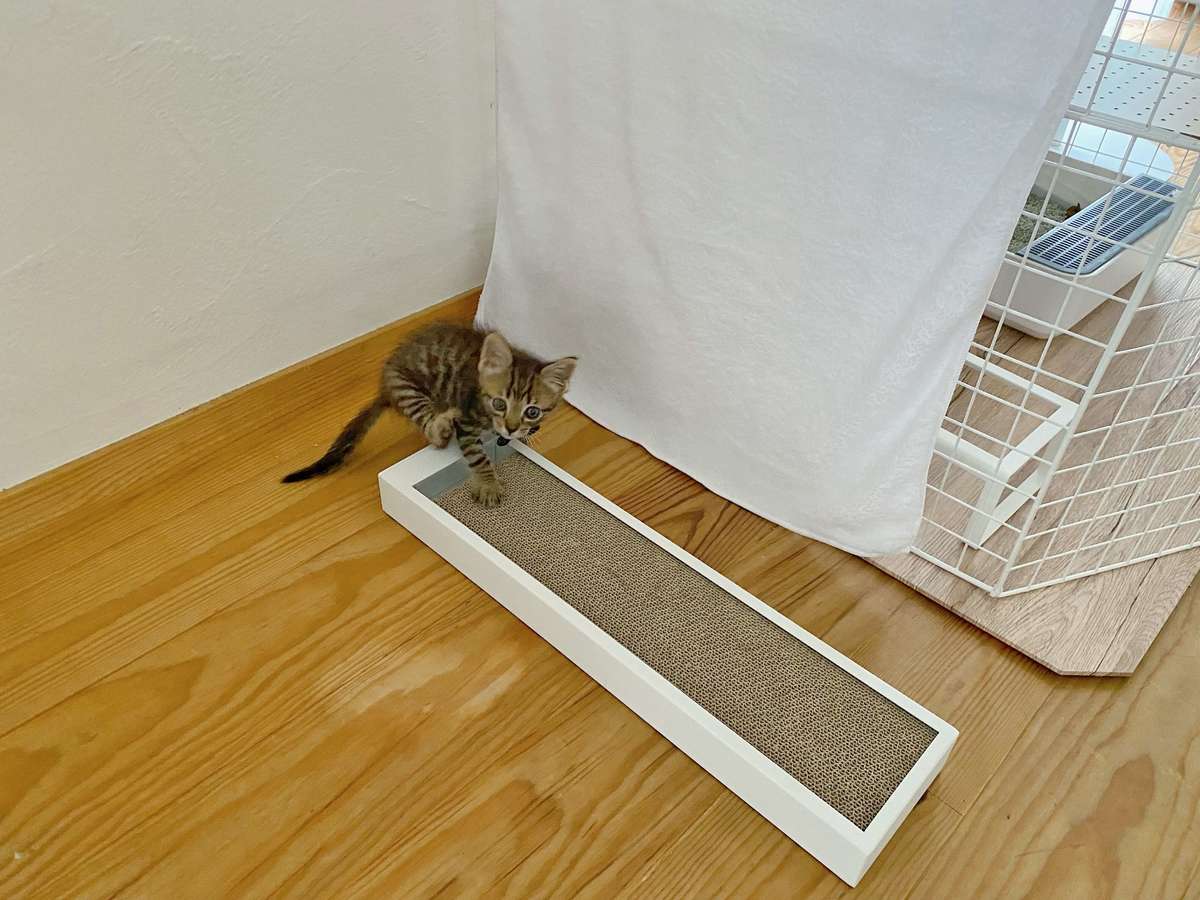 こちらの爪とぎケース(中身は別)、フードボウルはtowerのアイテムで揃えました。