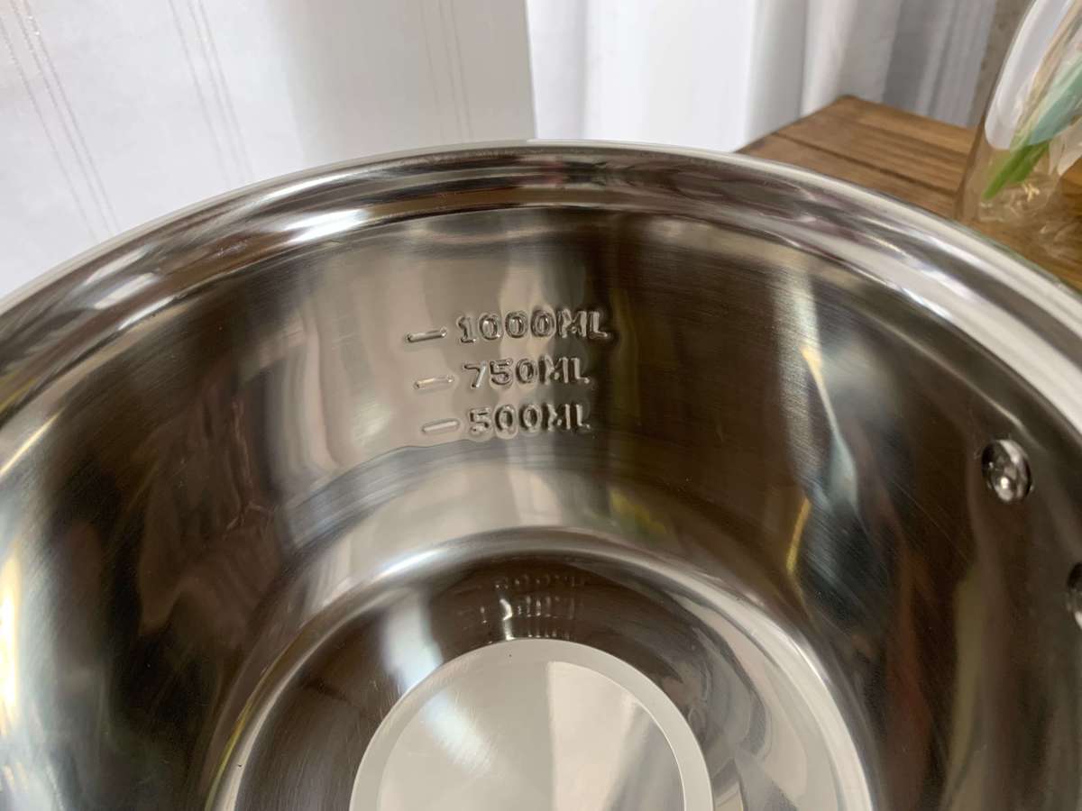 鍋の内側には500、750、1000mlと目盛付きなので、調理の時にも便利!