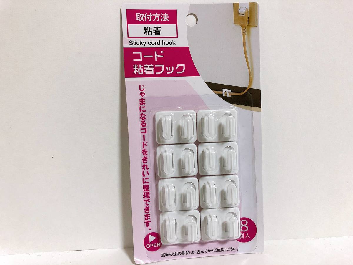 こちらは、邪魔になりがちな電源コードを綺麗に整えてくれる“コード粘着フック”(110円 税込)。