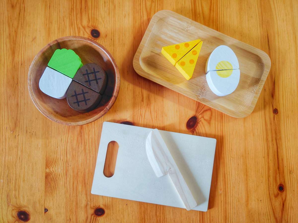 こちらはハンバーグと野菜が2つセットになった「ごちそうセット」、卵とチーズの「目玉焼きセット」、「まな板と包丁」です。
