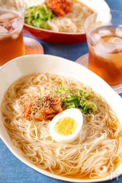 焼き肉屋さんで人気の冷麺を、そうめんでアレンジした一品。お酢が効いたつゆとキムチがよく合い、食欲が落ちた時でもつるっと食べやすいですよ。
