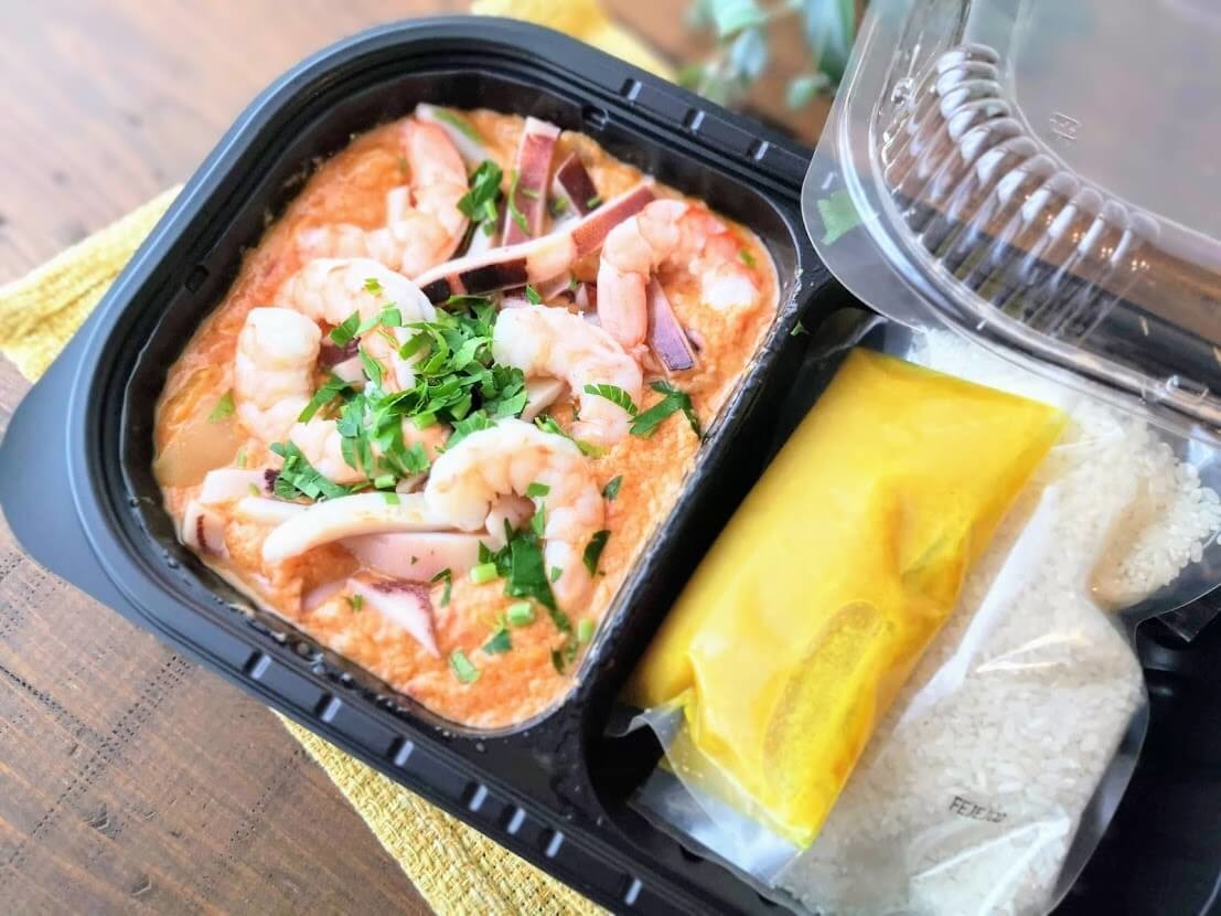 2つに仕切られたトレイの中には、半分にはエビやイカの煮込み料理が入っています。 もう半分には、お米と黄色の液体が入っています。