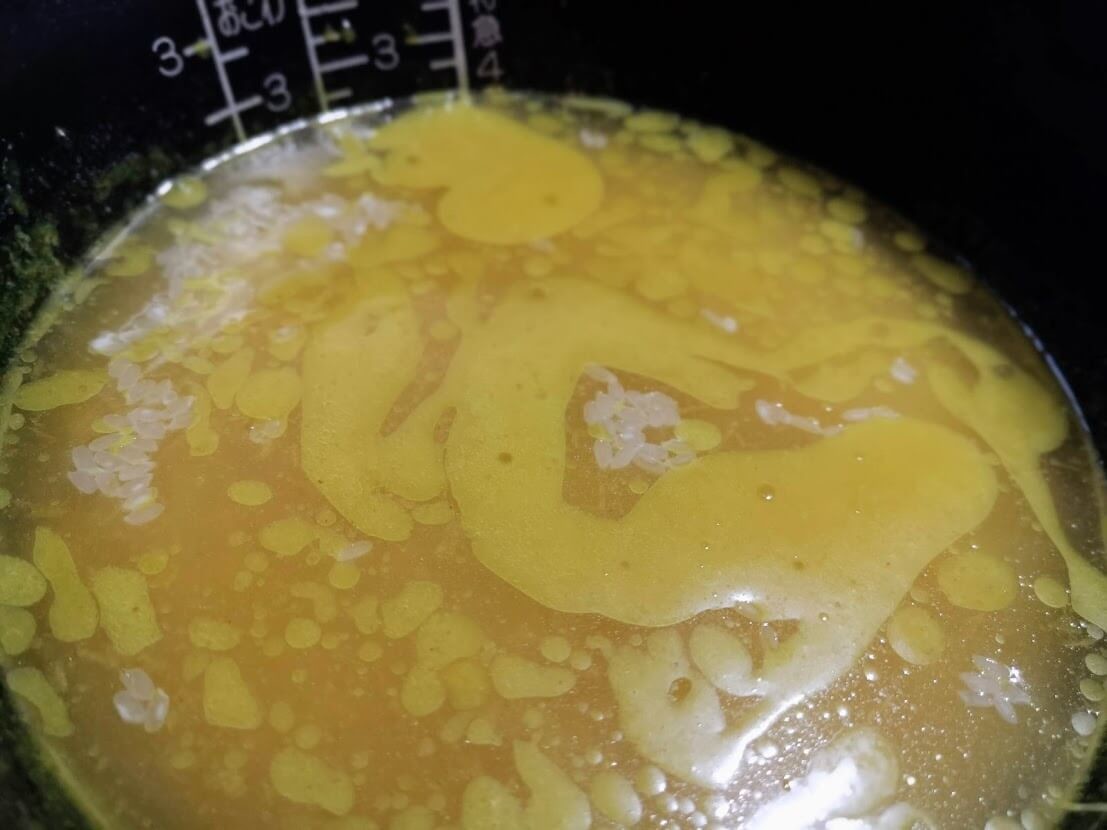 付属のお米は無洗米なのでそのまま炊飯器の内釜に入れます。そこへ調味油を注ぎ、2合の目盛りまで水を足します。 あとは、いつもどおりに炊飯するだけ!!