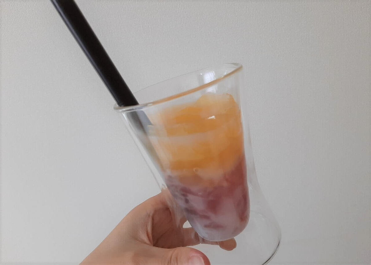 こちらは軽く崩した「ぶどう味」と「みかん味」を透明のグラスに入れて、上からカルピスを注いだドリンクです。