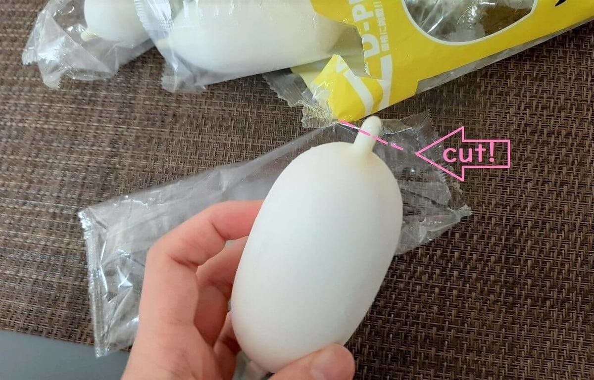 早速カットします。カットする場所が根元すぎると最後の方でアイスが一気に飛び出してくるのを防げなくなるので、突起の真ん中あたりを狙いましょう。