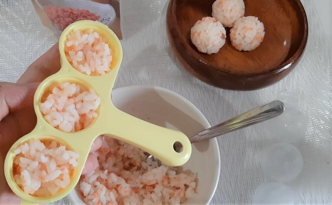 ちなみに100均の丸おにぎり専用アイテムを使っています。これを使えば楽に量産できるんです。