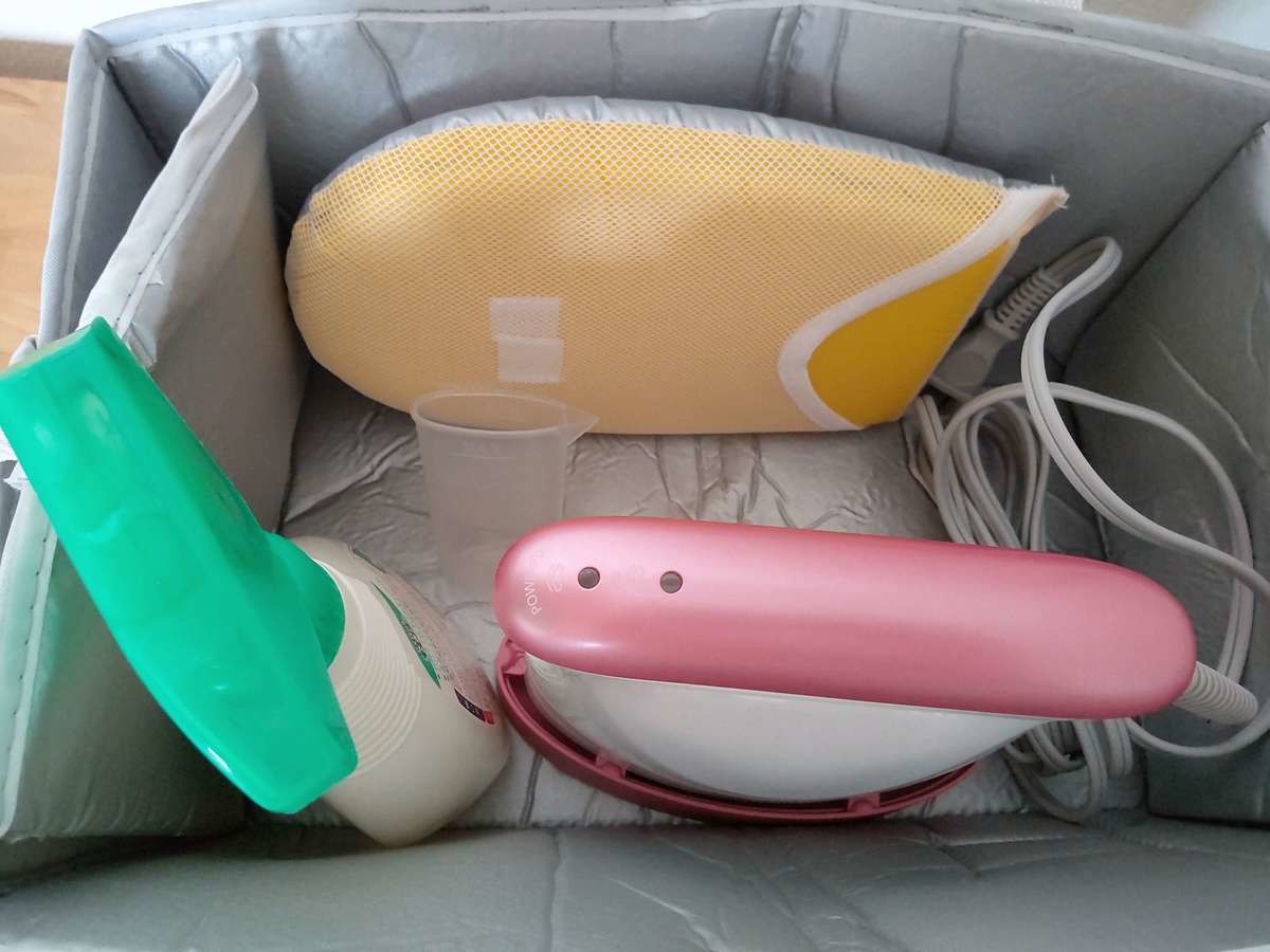 衣類スチーマー、付属品のカップ、アイロングローブ、アイロンスプレーなどをまとめて収納。