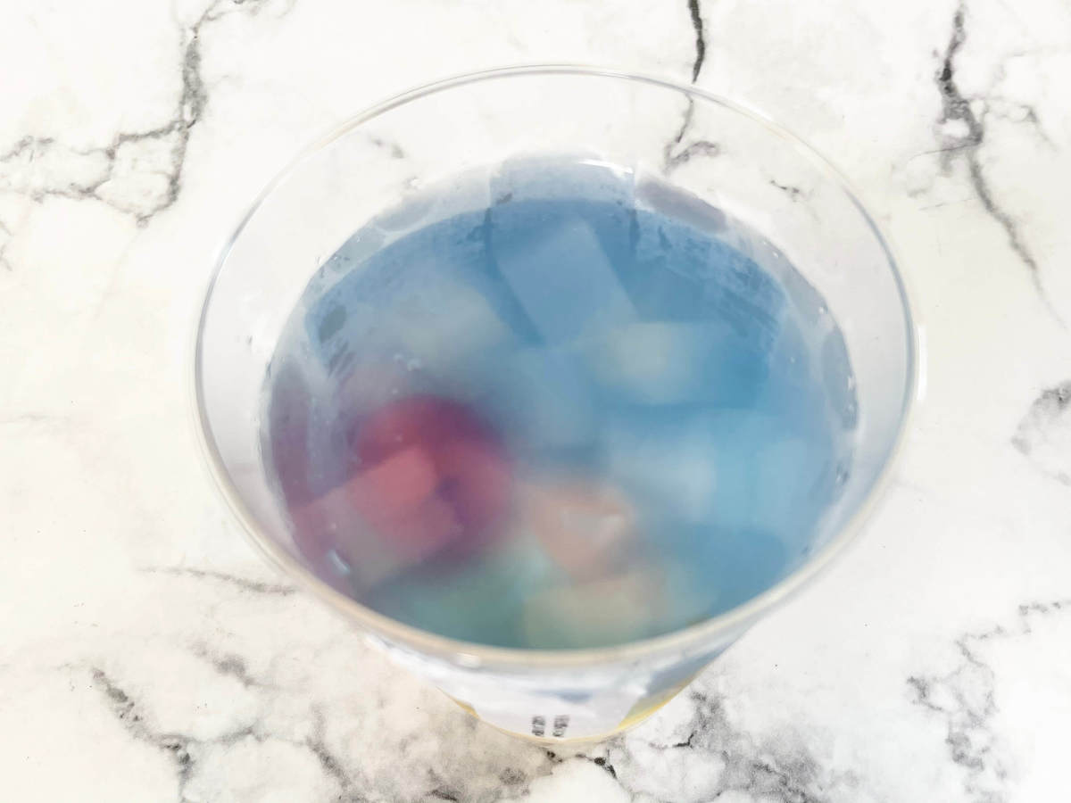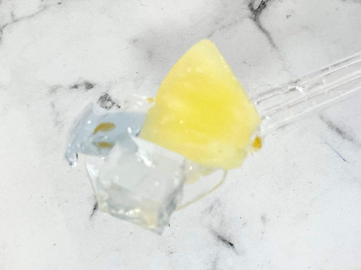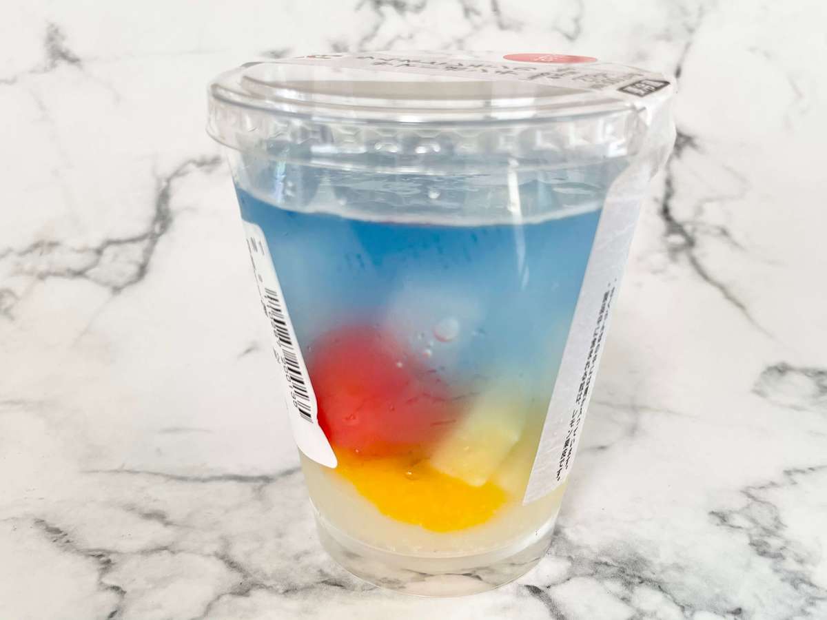 青色のラムネ風味ゼリーの中にレモン風味寒天ゼリー、みかん、パイン、さくらんぼ、みるくわらび、レモンピール入りのレモンゼリーが入っています。