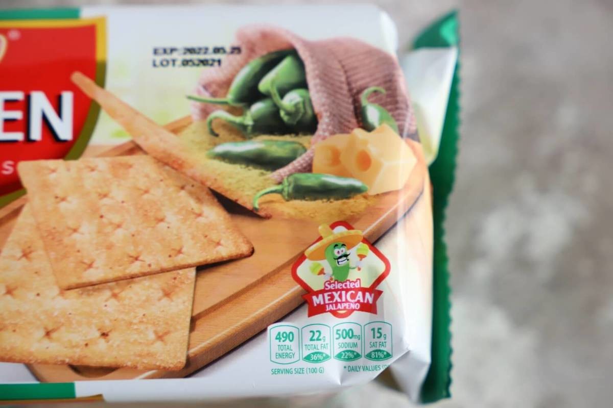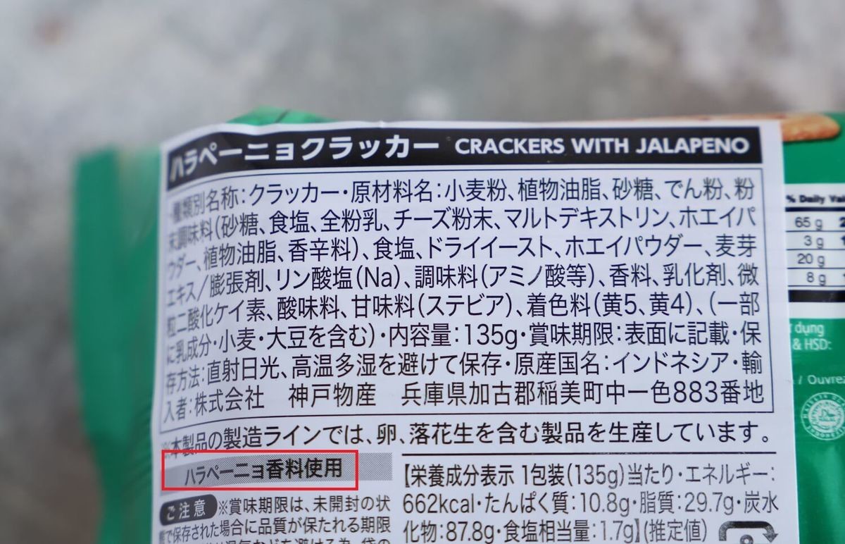 商品名はハラペーニョクラッカーとなっていますが、パッケージにはチーズの写真もあり原材料をみると「チーズ粉末」と記載がありました。