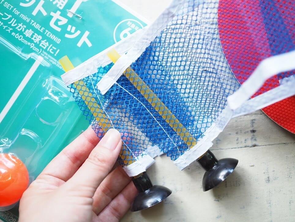 ミニ卓球用ネットセットは、吸盤でくっつけるとテーブルが簡易卓球台になるというスグレモノ♪