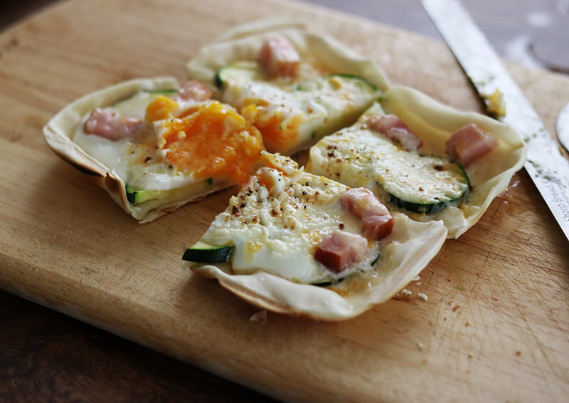 今回は夏らしくズッキーニに、ベーコン、卵をのせました。