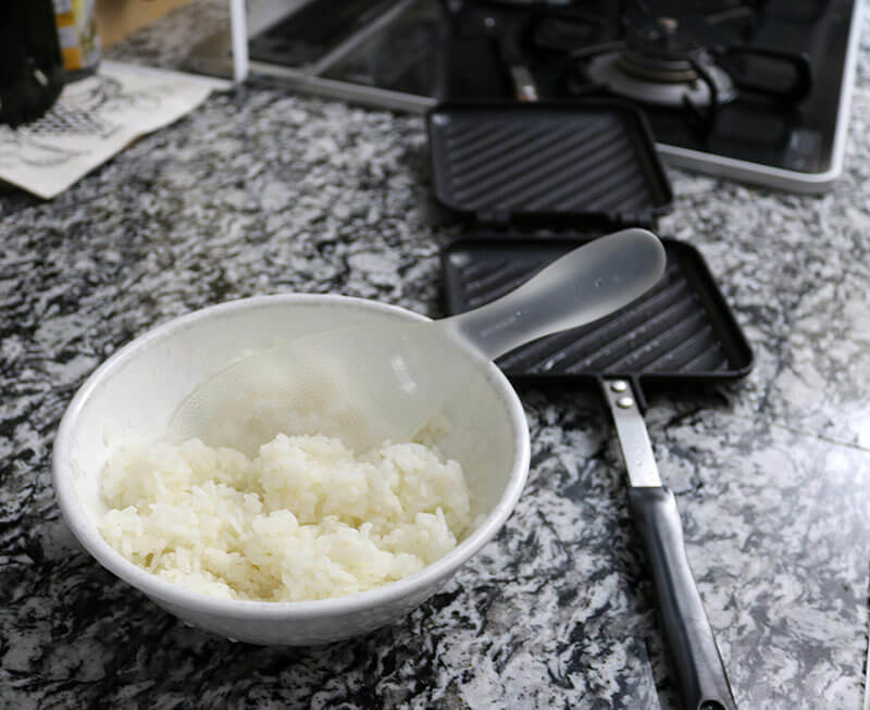 直火式ホットサンドメーカーで是非トライしたかったのが、「ライスバーガー」。