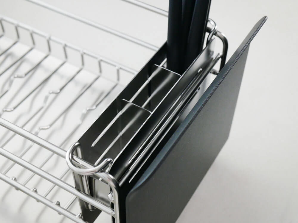 テコの原理を使った新発想で、不安定なまな板と包丁の新しい特等席を作ってくれるスタンドを「ディッシュドレイナー」に引っ掛ければ完了。