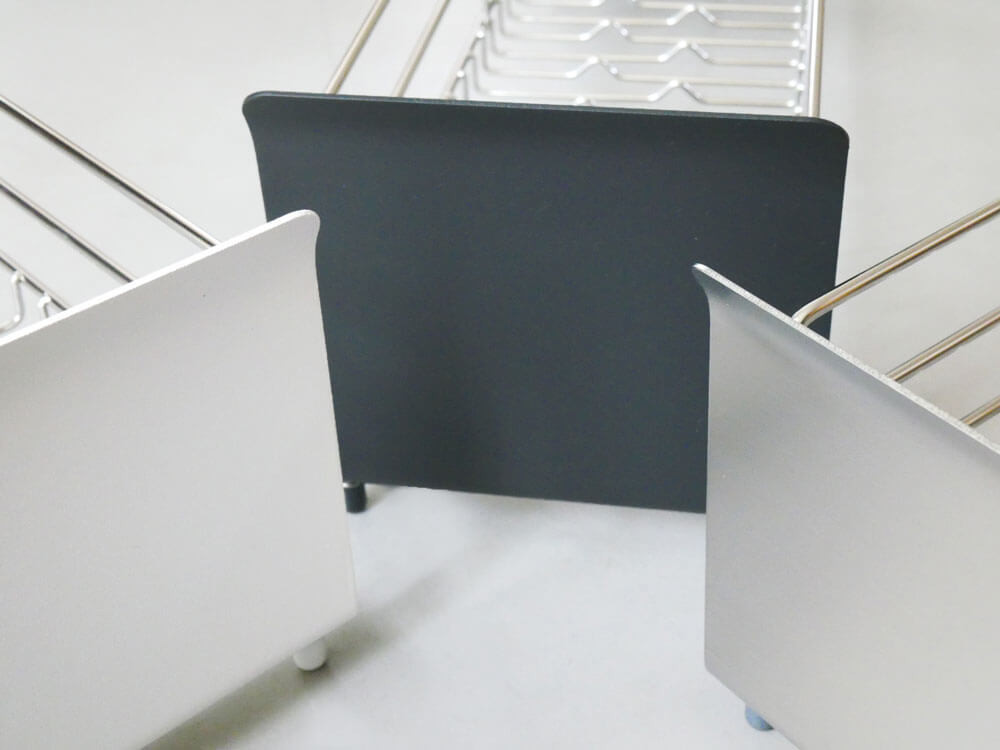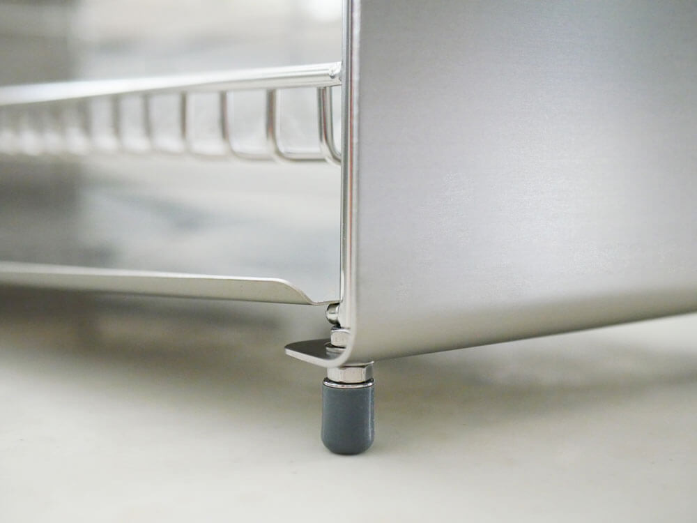 ステンレス素材をそのまま使用したソリッドシルバーはもちろん、ピュアホワイトとカームグレーの側板も、耐水性や防錆効果が高い「エポキシ樹脂粉体塗装」をステンレスに施してあるので、どのカラーもキッチンで安心してお使いいただけますよ。
