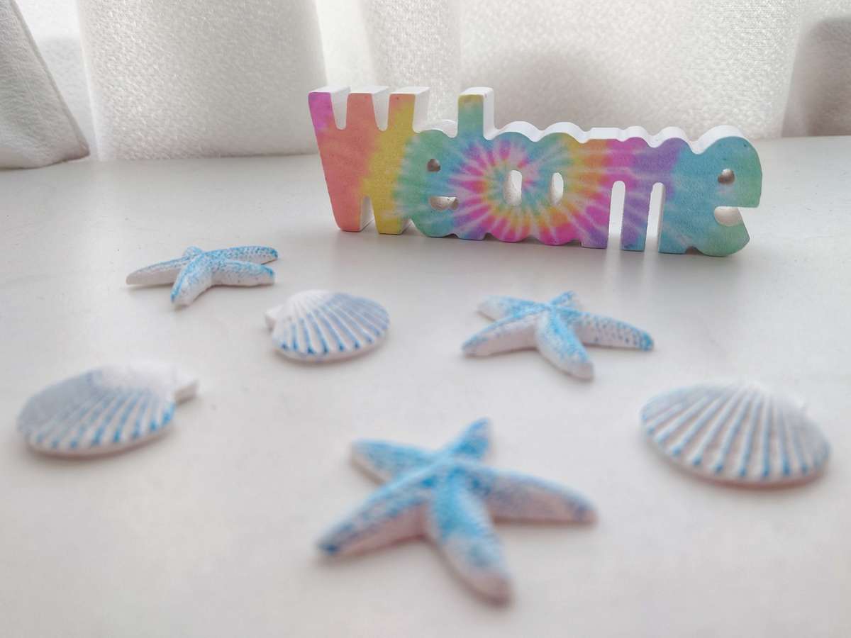 「Welcome」の文字がタイダイ柄で綺麗に塗られた木の置物は110円(税込)。