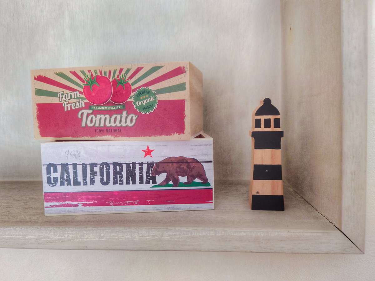 カリフォルニアの文字が印象的です。赤が基調のトマトやくま柄のシールが貼られています。